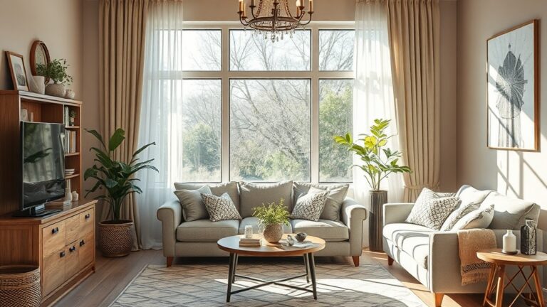 Светлая спальня с украшениями, уютной кроватью и зелеными растениями у окна. Теплая атмосфера и стильный интерьер.